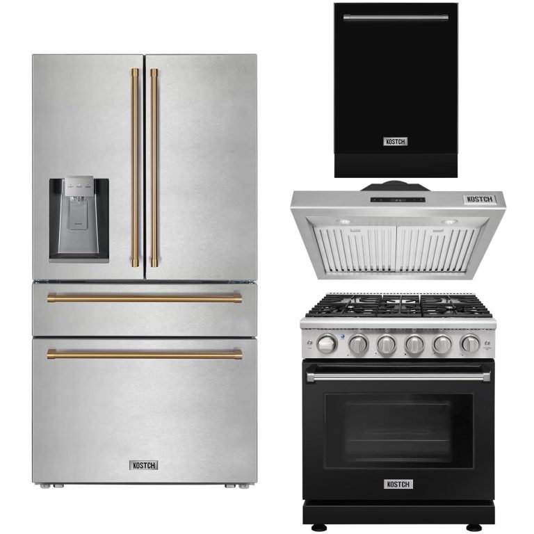 30″ Natural Gas Range with 30″ Range Hood, 24″ Built-In Dishwasher in Black & 36″ French Door Refrigerator with Bronze Handle Kitchen Appliance Set