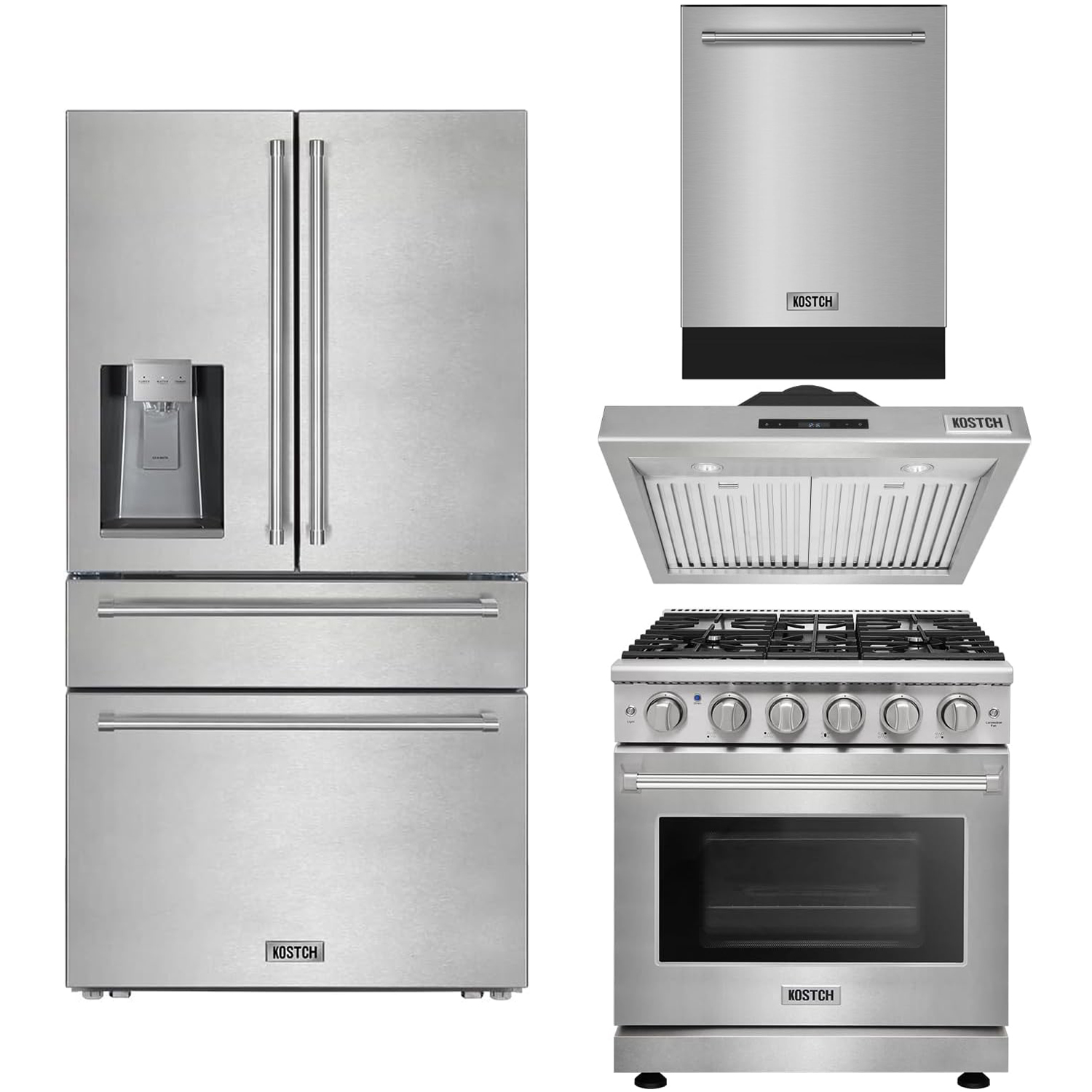 30″ Natural Gas Range with 30″ Range Hood, 24″ Built-In Dishwasher in Stainless Steel & 36″ French Door Refrigerator with Stainless Steel Handle Kitchen Appliance Set